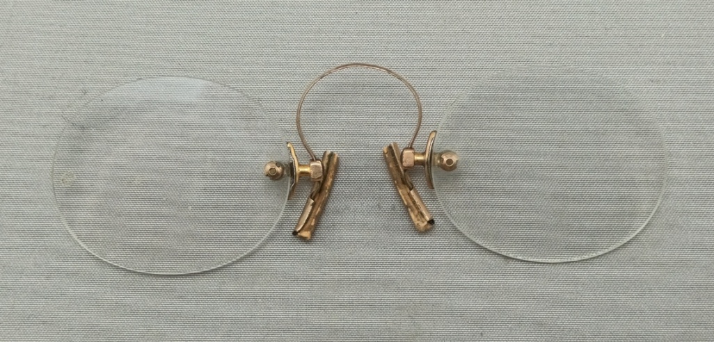 Catalogue Number: 4552 Gold rimless oval pince-nez Category: Spectacles and lenses Sub-Category: Pince-nez Year Of Publication/Manufacture: c1910 Time Period: 1900 to 1939 Description Of Item: Rimless oval pince-nez with gold plated small loop, or C-Spring, bridge marked '1 30 10K'. Gold nose pad mounts with cork pads. Lenses +0.25 DS R & L. Dimensions: 103 mm x 24 mm Historical Significance: From the practice of John Garratt, grandfather of the donor. How Acquired: Donated by John Boxshall Date Acquired: 2/6/2025 Condition: Very good Location: Documents Room Orange Daytona Cabinet Drawer 3 |