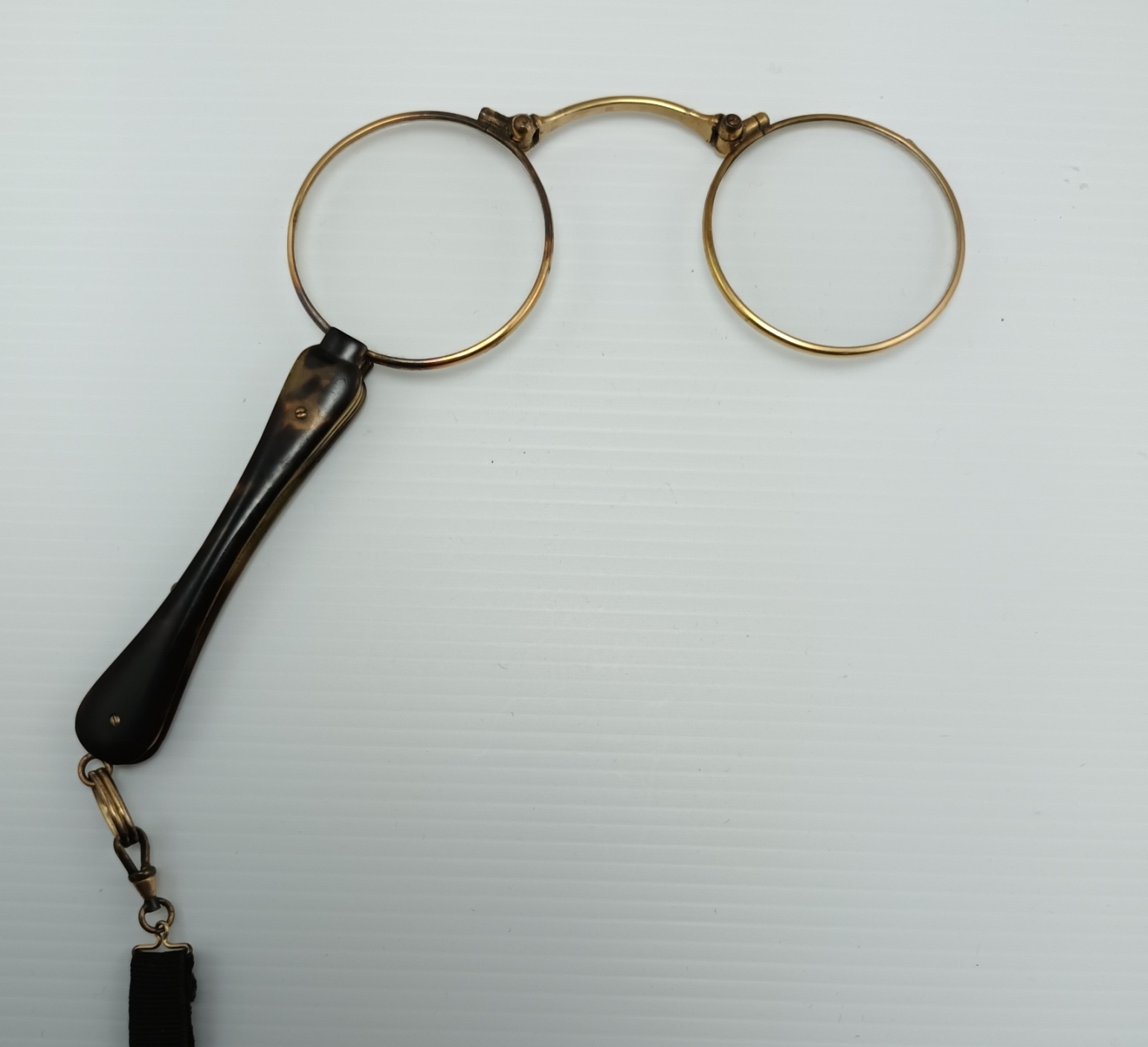 | Catalogue Number: 4575 Gold round eye sprung folding lorgnette Category: Spectacles and lenses Sub-Category: Lorgnette Year Of Publication/Manufacture: c1905 Time Period: 1900 to 1939 Place Of Publication/Manufacture: Europe Description Of Item: Gold round eye spring folding lorgnette. Gold rim and bridge, impressed with square logo beneath bridge. Tortoiseshell mounts to handle. Black ribbon attached with gold snap shackle. Lens powers: plano and +3.00 DS. Dimensions, open, excluding ribbon: 108 x 110mm Historical Significance: From the practice of John Garratt, grandfather of the donor How Acquired: Donated by John Boxshall Date Acquired: 2.06.2025 Condition: Very good Location: Documents Room Orange Daytona Cabinet Drawer 4 |