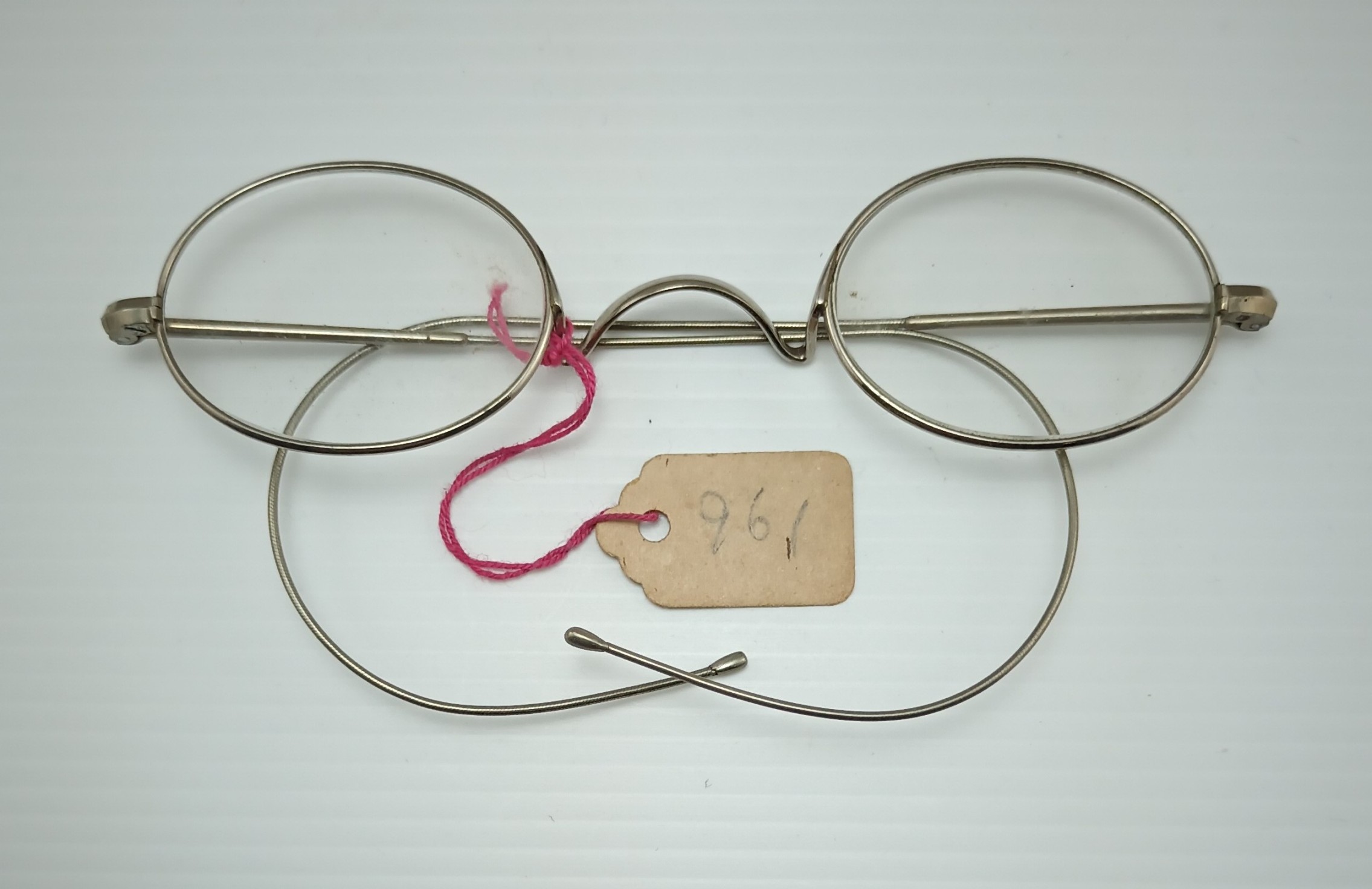 | Catalogue Number: 4567 Silver oval eye spectacles with curl sides and 'W' bridge Category: Spectacles and lenses Sub-Category: Spectacles (with lenses) Year Of Publication/Manufacture: c1910 Time Period: 1900 to 1939 Description Of Item: Silver coloured oval eye spectacles with curl sides and 'W' bridge. Lens powers: +1.00 DS R&L. Small buff swing tag on red cotton labelled by hand 'R & L +1' on one side, and '961' or '196' on the other. Dimensions:113 x 57mm. Historical Significance: From the practice of John Garratt, grandfather of the donor How Acquired: Donated by John Boxshall Date Acquired: 2.06.2025 Condition: Very good Location: Documents Room Orange Daytona Cabinet Drawer 4 |
