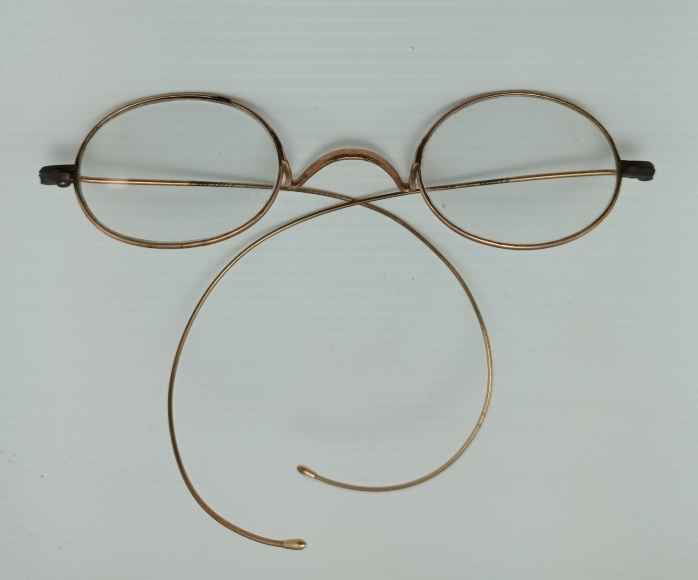 | Catalogue Number: 4566 Rolled gold oval spectacles with 'W' bridge and curl sides Category: Spectacles and lenses Sub-Category: Spectacles (with lenses) Year Of Publication/Manufacture: c1910 Time Period: 1900 to 1939 Description Of Item: Rolled gold oval eye spectacles with 'W' bridge and curl sides. Marked on rear of bridge 'RG'. Lens powers RE: +1.00 DS L: +0.75 DS. Dimensions:112 x 78mm Historical Significance: From the practice of John Garratt, grandfather of the donor How Acquired: Donated by John Boxshall Date Acquired: 2.06.2025 Condition: Very good Location: Documents Room Orange Daytona Cabinet Drawer 4 |