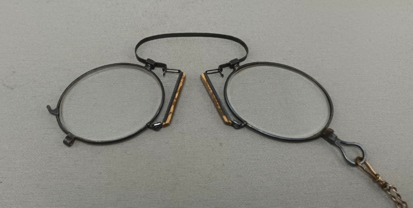 | Catalogue Number: 4556 Blued steel folding pince-nez with chain, glazed Category: Spectacles and lenses Sub-Category: Pince-nez Year Of Publication/Manufacture: c1910 Time Period: 1900 to 1939 Description Of Item: Oval eye blued steel pince-nez with medium arched bridge and long, sprung cork nose pads. Glazed: R +1.25 DS, L +1.50 DS.. One eyerim has mount with chain, other has a small spur to secure the pince-nez when it is folded for storage. Some mild corrosion to surface. Dimensions: 107 mm x 52 mm Historical Significance: From the practice of John Garratt, grandfather of the donor. How Acquired: Donated by John Boxshall Date Acquired: 2/6/2025 Condition: Good Location: Documents Room Orange Daytona Cabinet Drawer 3 |