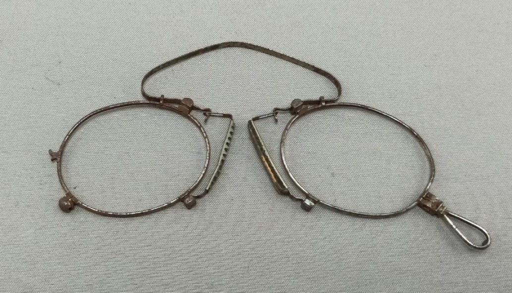 | Catalogue Number: 4555 Unglazed pince-nez, large arched bridge Category: Spectacles and lenses Sub-Category: Pince-nez Year Of Publication/Manufacture: c1910 Time Period: 1900 to 1939 Description Of Item: Oval eye pince-nez with large arched bridge and long, sprung nose pads of ridged metal, unglazed. One eyerim has mount for ribbon, other has a small spur to improve handling. Much corrosion to surface nickel plating.Dimensions: 110 mm x 56 mm Historical Significance: From the practice of John Garratt, grandfather of the donor. How Acquired: Donated by John Boxshall Date Acquired: 2/6/2025 Condition: Fair Location: Documents Room Orange Daytona Cabinet Drawer 3 |