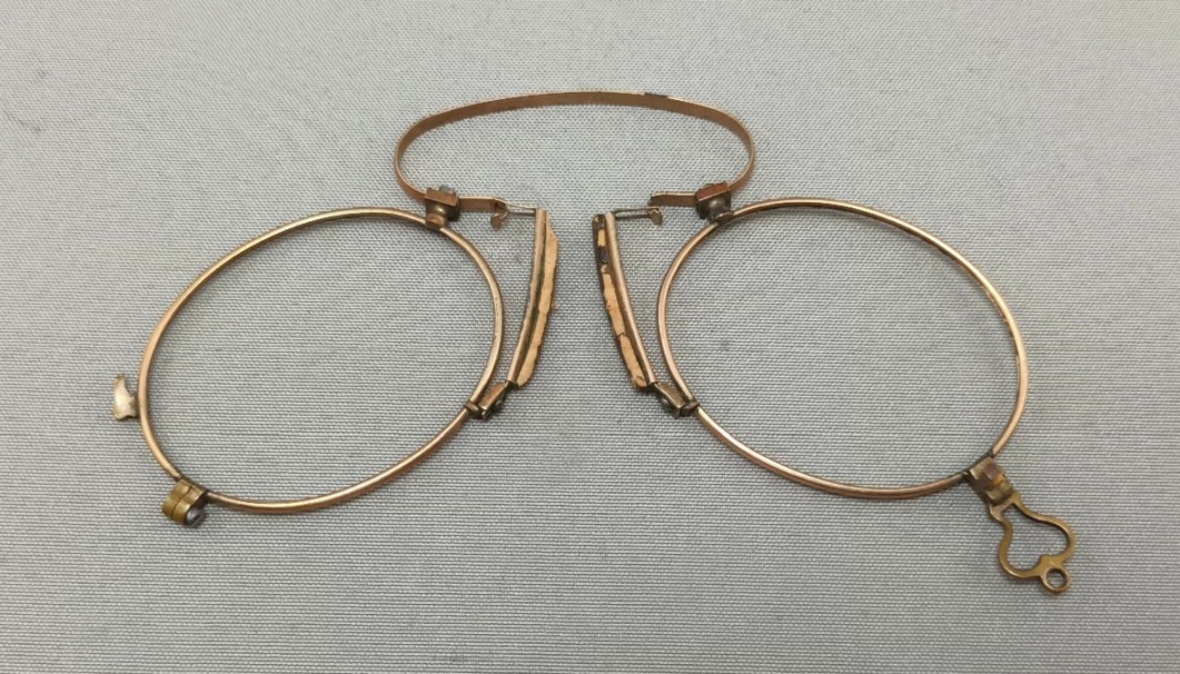 | Catalogue Number: 4554 Unglazed gold pince-nez, medium arched bridge Category: Spectacles and lenses Sub-Category: Pince-nez Year Of Publication/Manufacture: c1910 Time Period: 1900 to 1939 Description Of Item: Oval eye pince-nez with medium arched bridge and long, sprung cork nose pads, unglazed. One eyerim has mount for ribbon, other has a small spur to secure the pince-nez when it is folded for storage. Some scratches and decay to gold plating.Dimensions: 88 mm x 47 mm Historical Significance: From the practice of John Garratt, grandfather of the donor. How Acquired: Donated by John Boxshall Date Acquired: 2/6/2025 Condition: Good Location: Documents Room Orange Daytona Cabinet Drawer 3 |