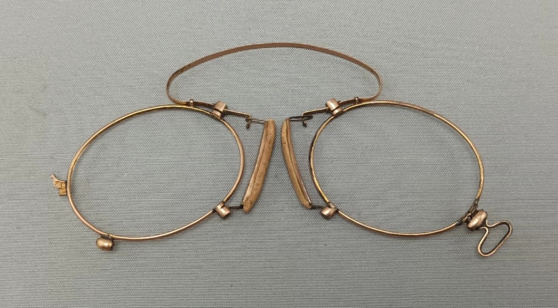 | Catalogue Number: 4553 Unglazed gold pince-nez, large arched bridge Category: Spectacles and lenses Sub-Category: Pince-nez Year Of Publication/Manufacture: c1910 Time Period: 1900 to 1939 Description Of Item: Oval eye pince-nez with large arched bridge and long, sprung cork nose pads, unglazed. One eyerim has mount for ribbon, other has a small spur to secure the pince-nez when it is folded for storage. Some scratches and decay to gold plating.Dimensions: 95 mm x 50 mm Historical Significance: From the practice of John Garratt, grandfather of the donor. How Acquired: Donated by John Boxshall Date Acquired: 2/6/2025 Condition: Very good Location: Documents Room Orange Daytona Cabinet Drawer 3 |